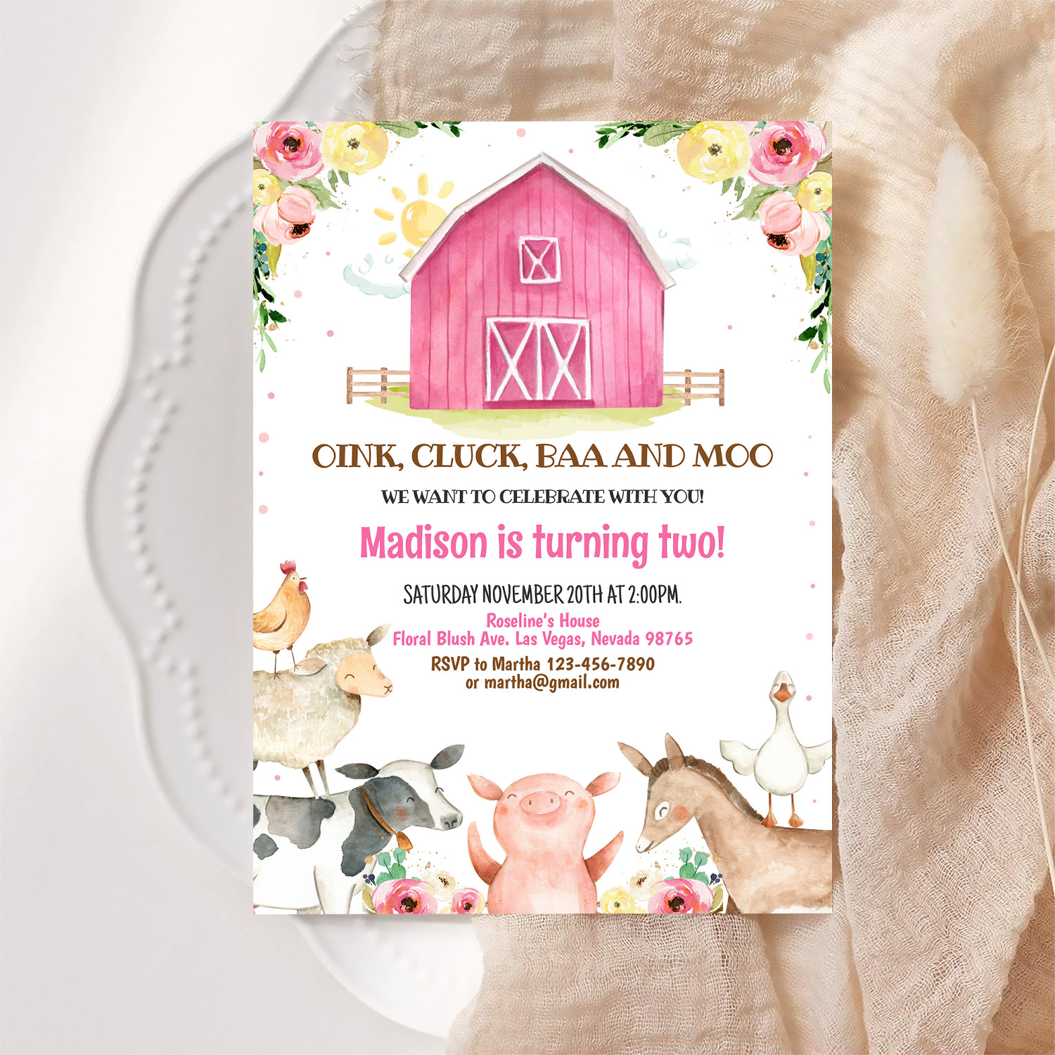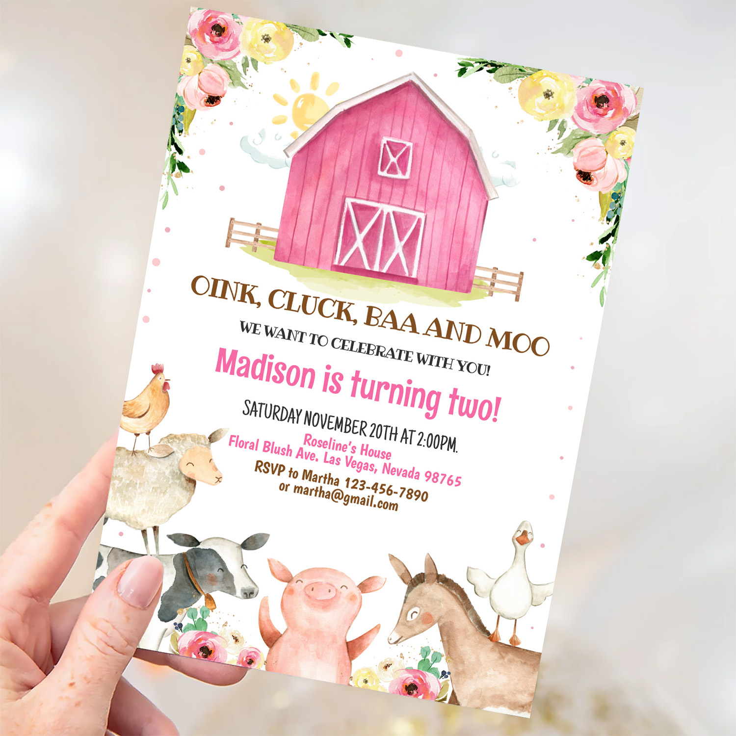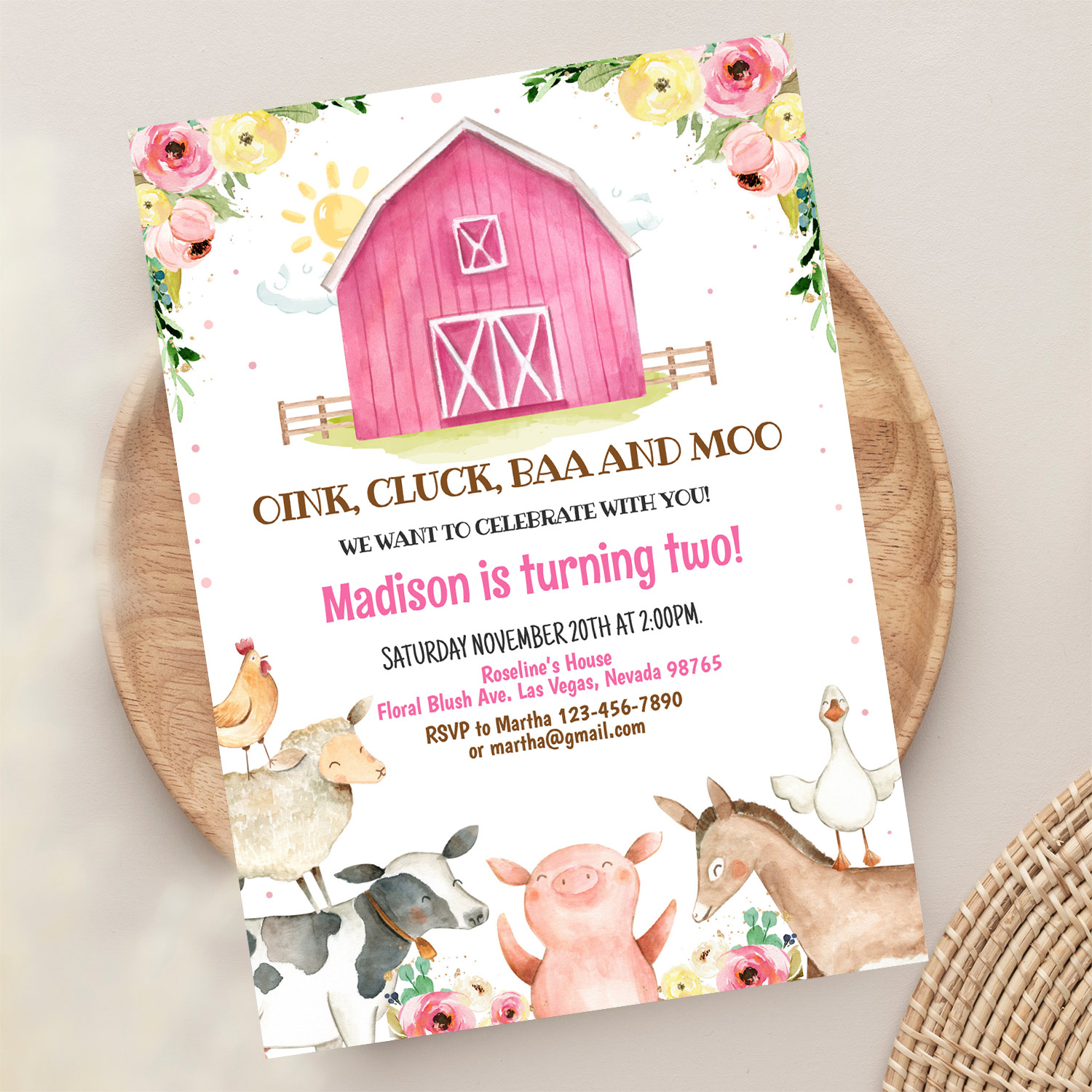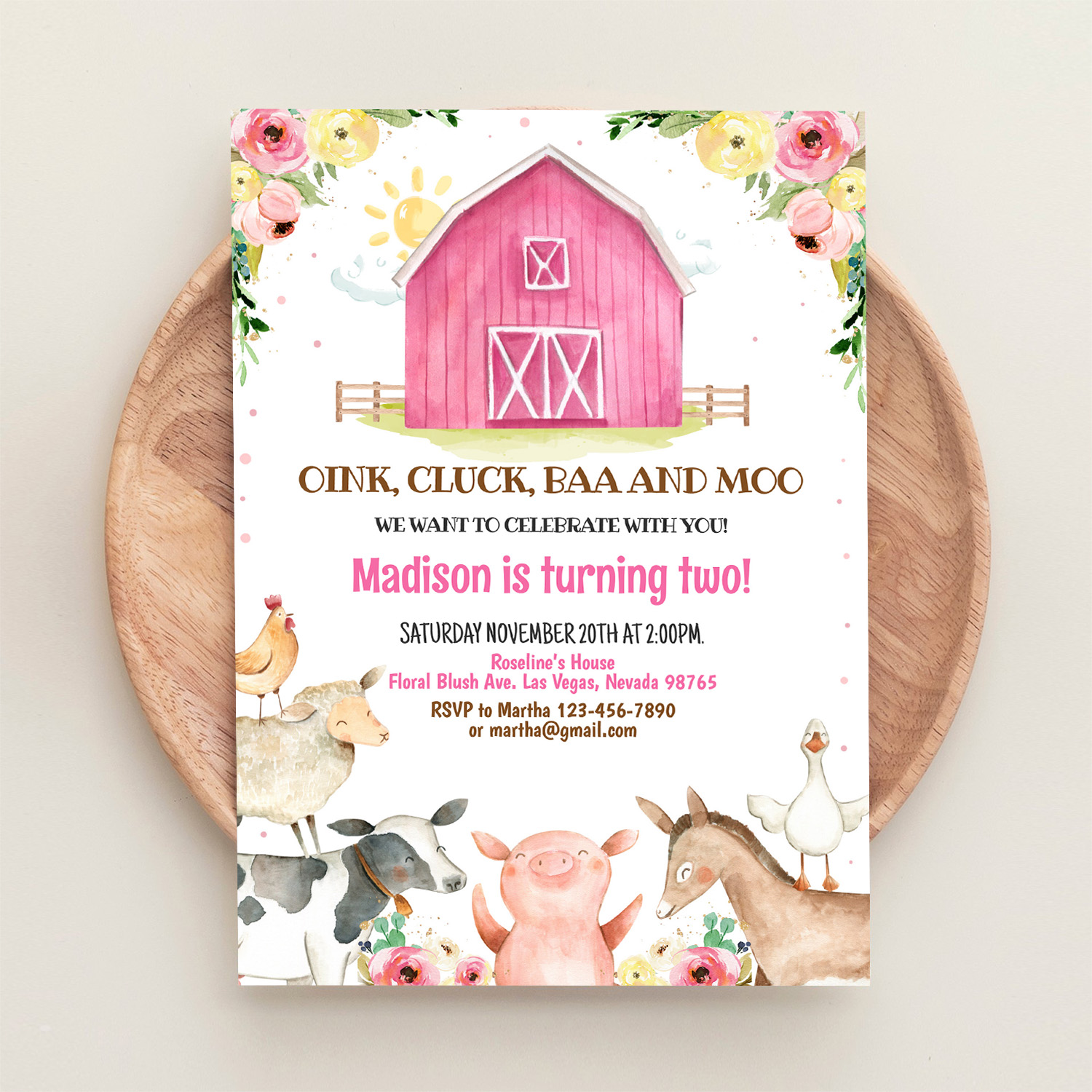 Girl Barn Party Farm Animals Barnyard Birthday Invitation