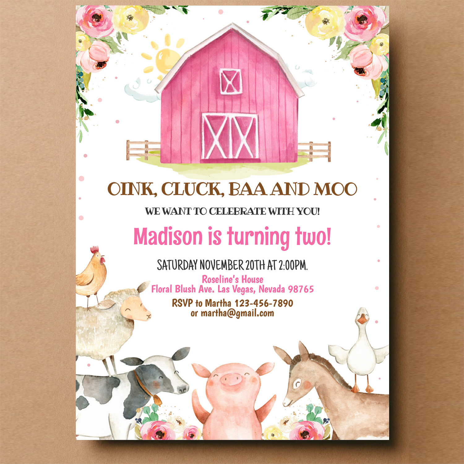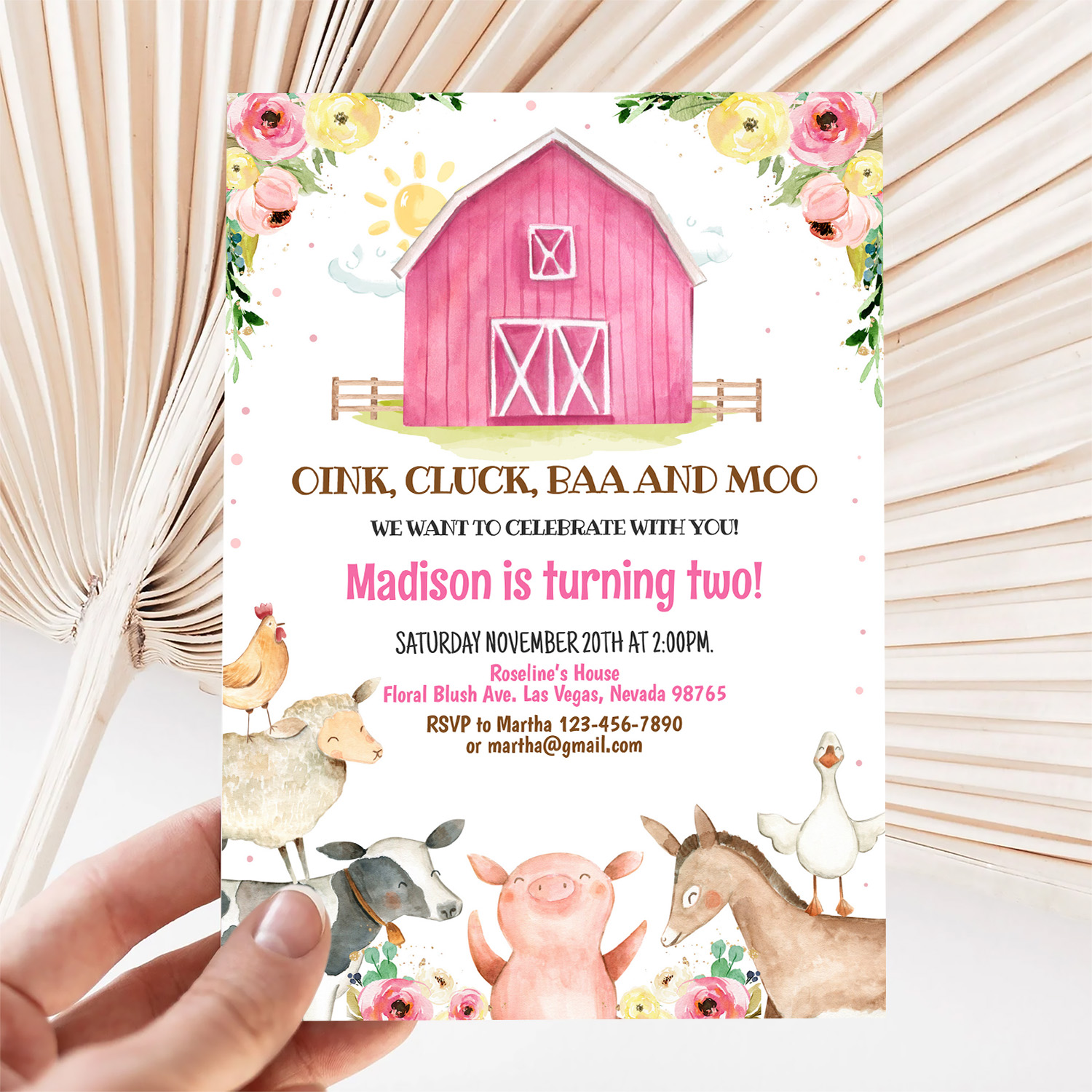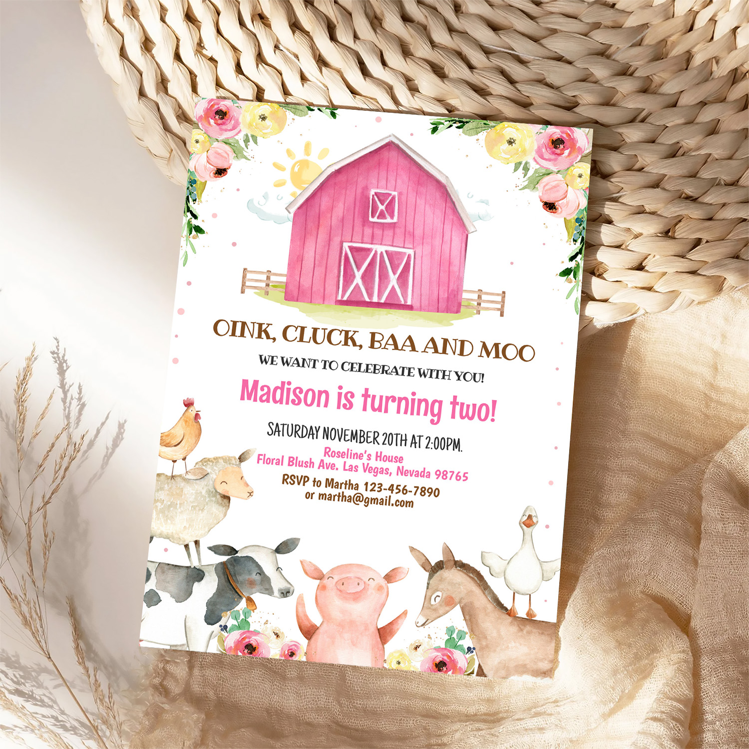 Girl Barn Party Farm Animals Barnyard Birthday Invitation