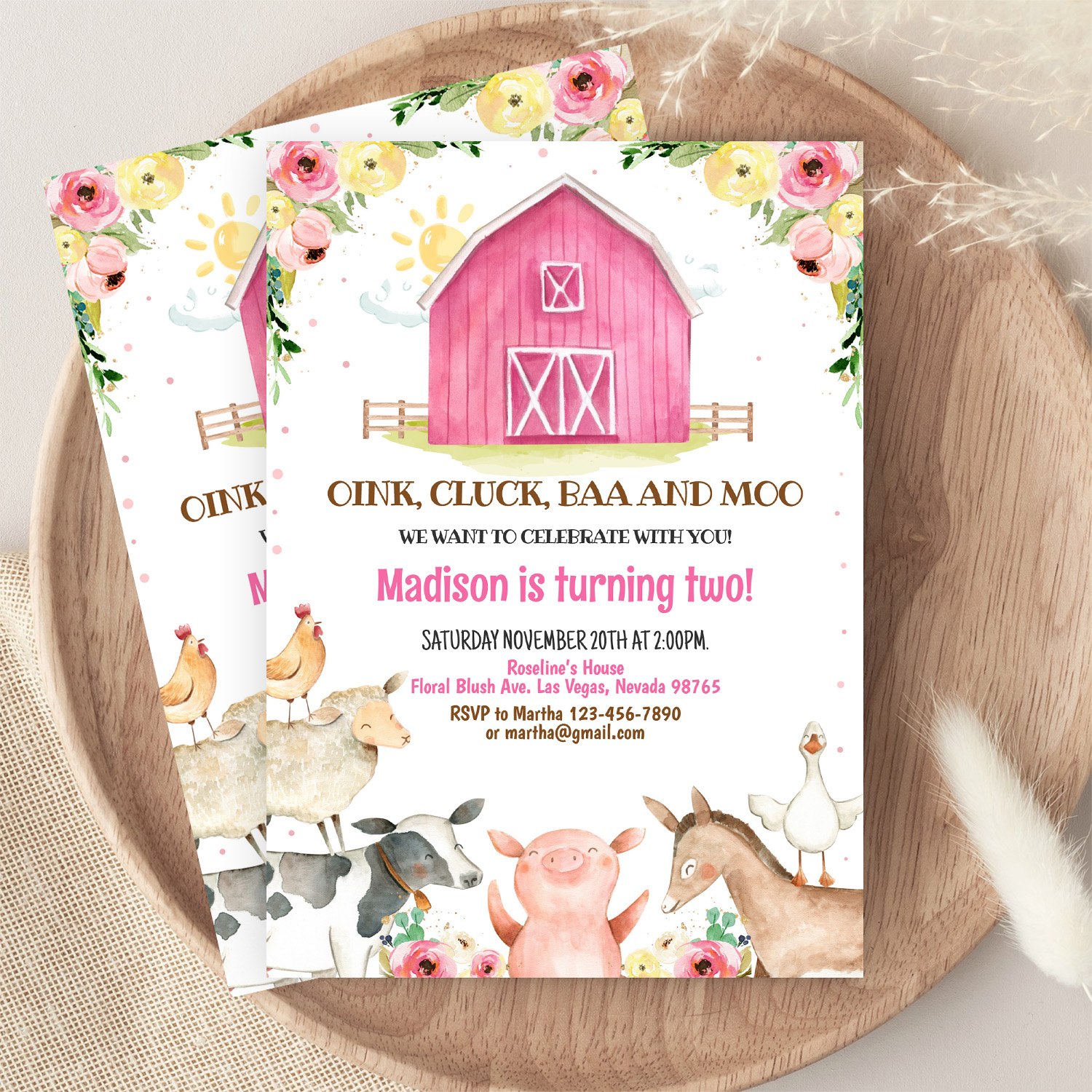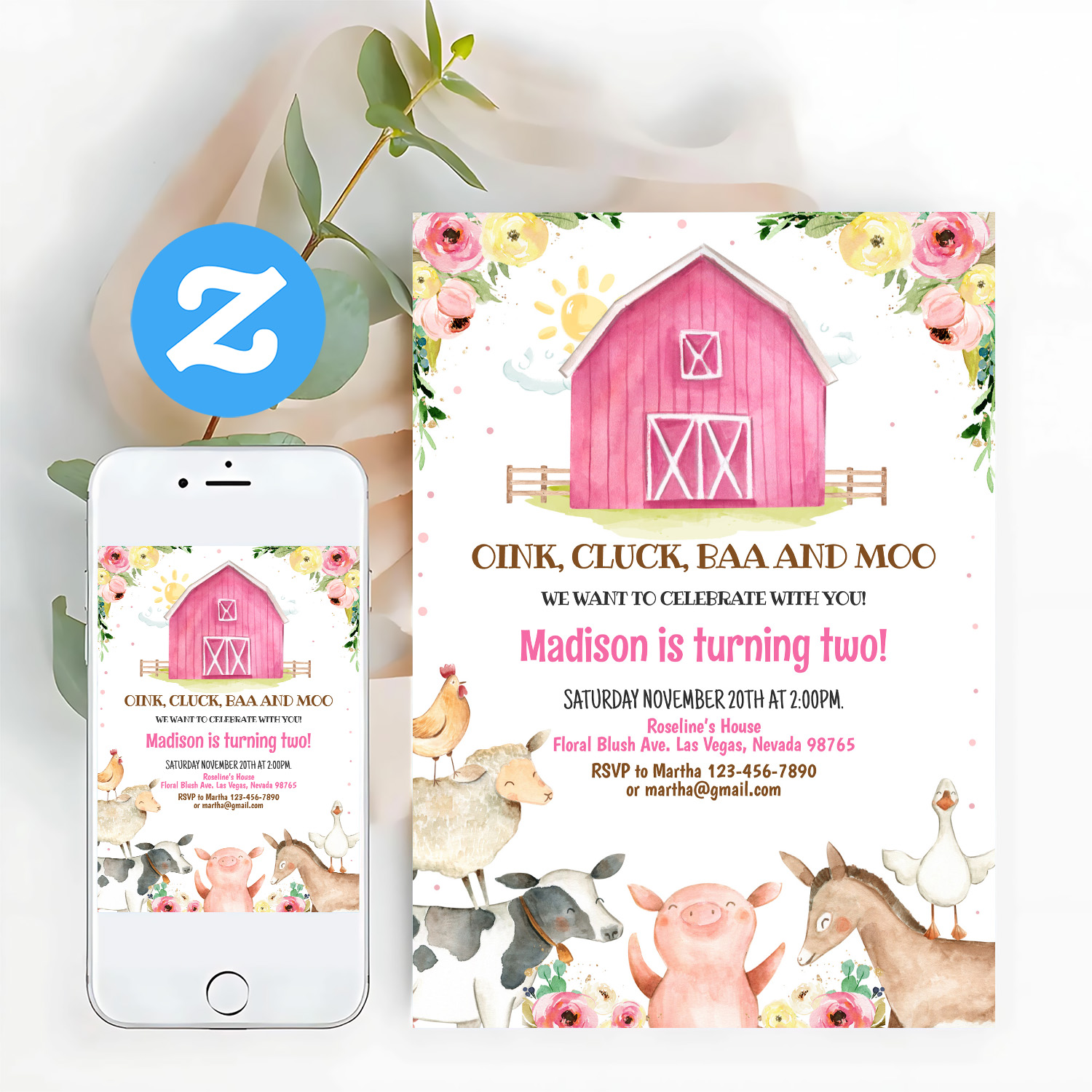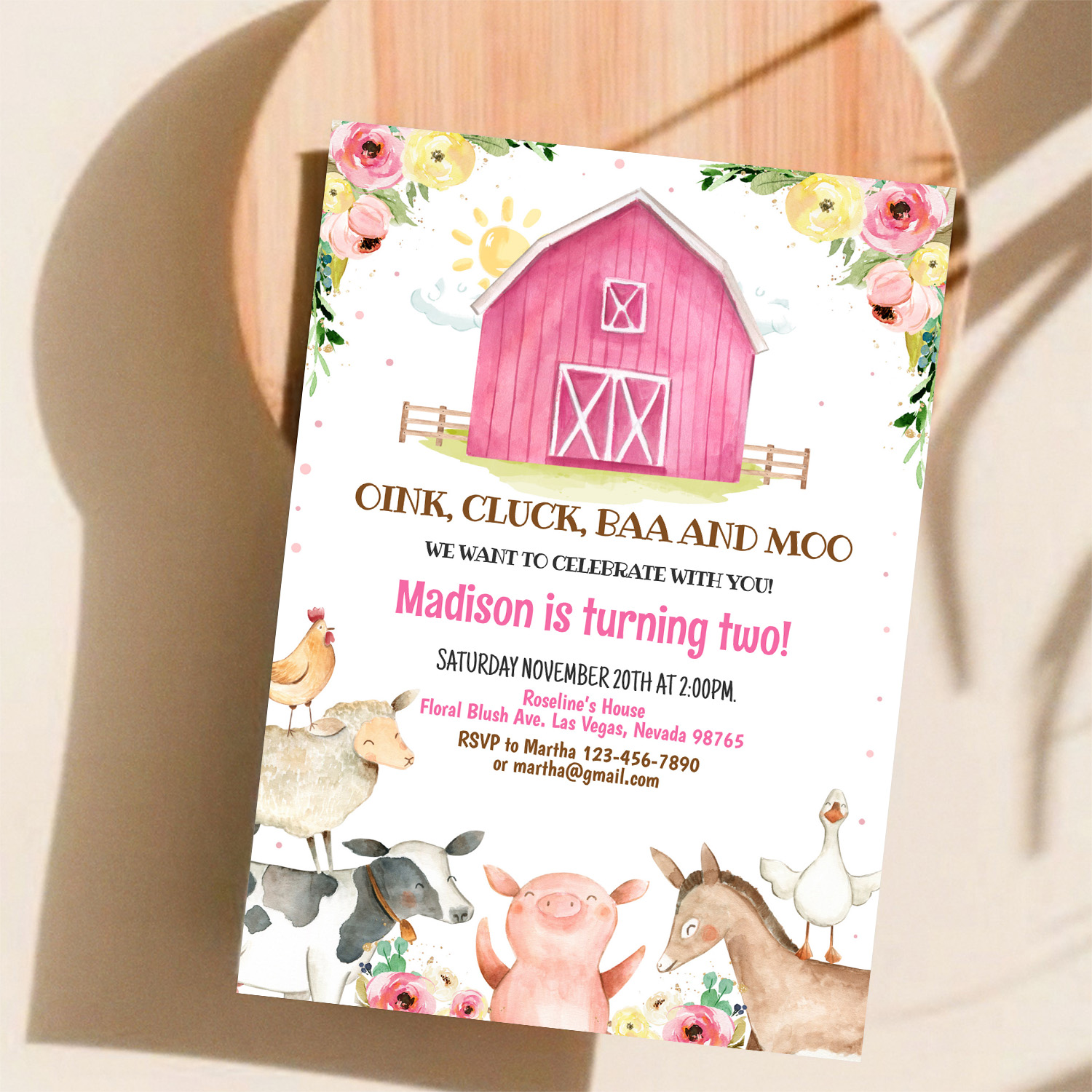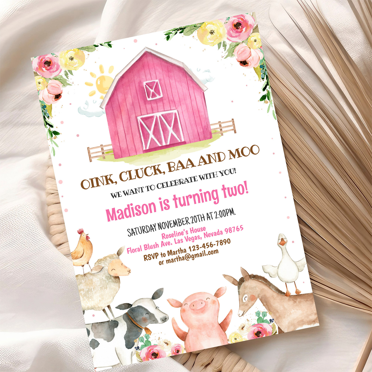 Girl Barn Party Farm Animals Barnyard Birthday Invitation