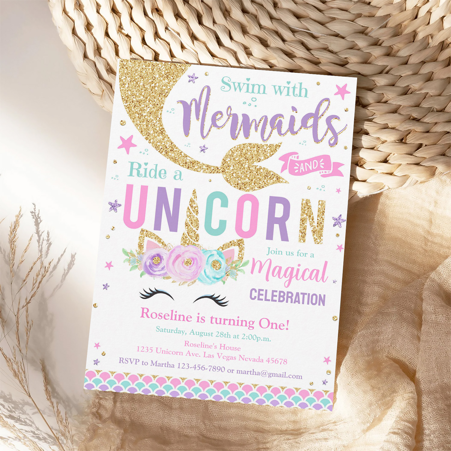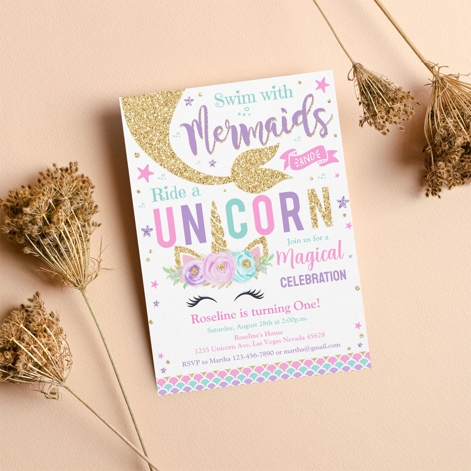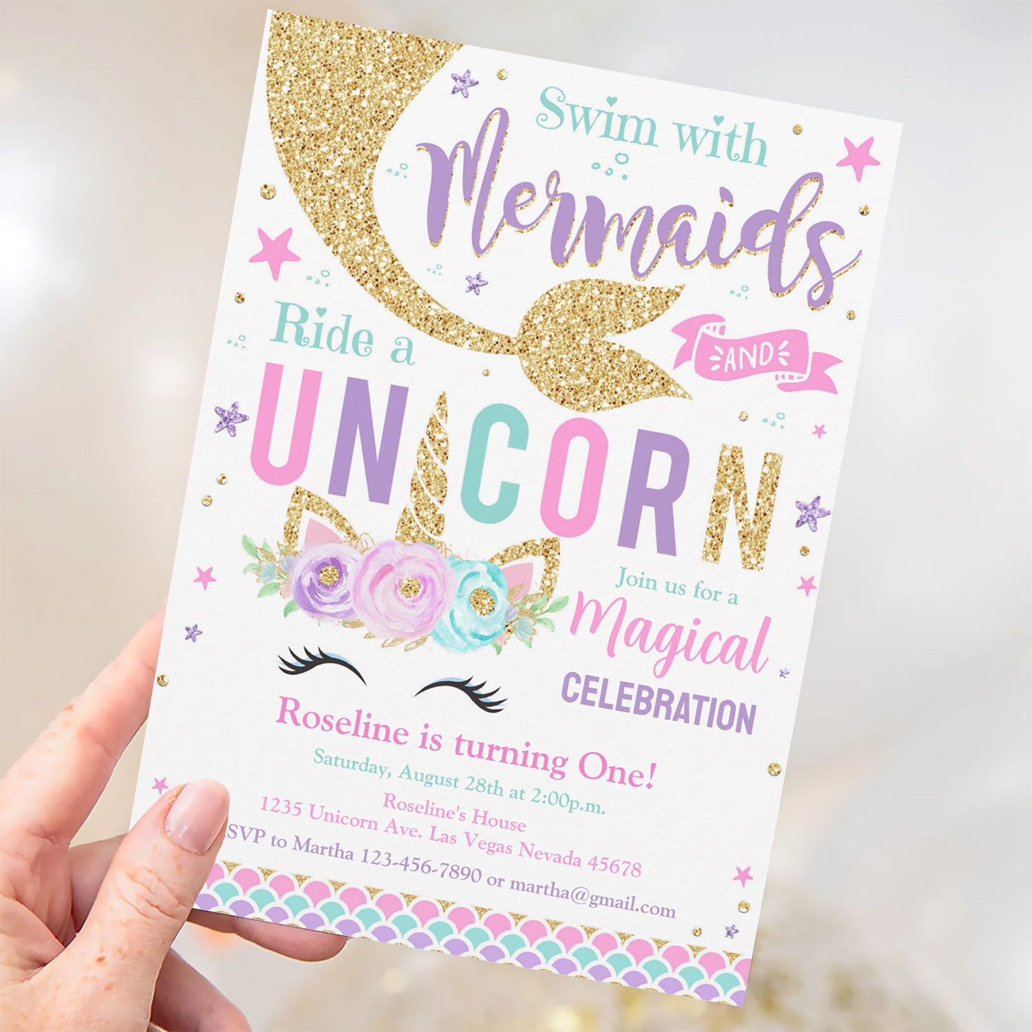 Mermaid And Unicorn Magical Birthday Invitation