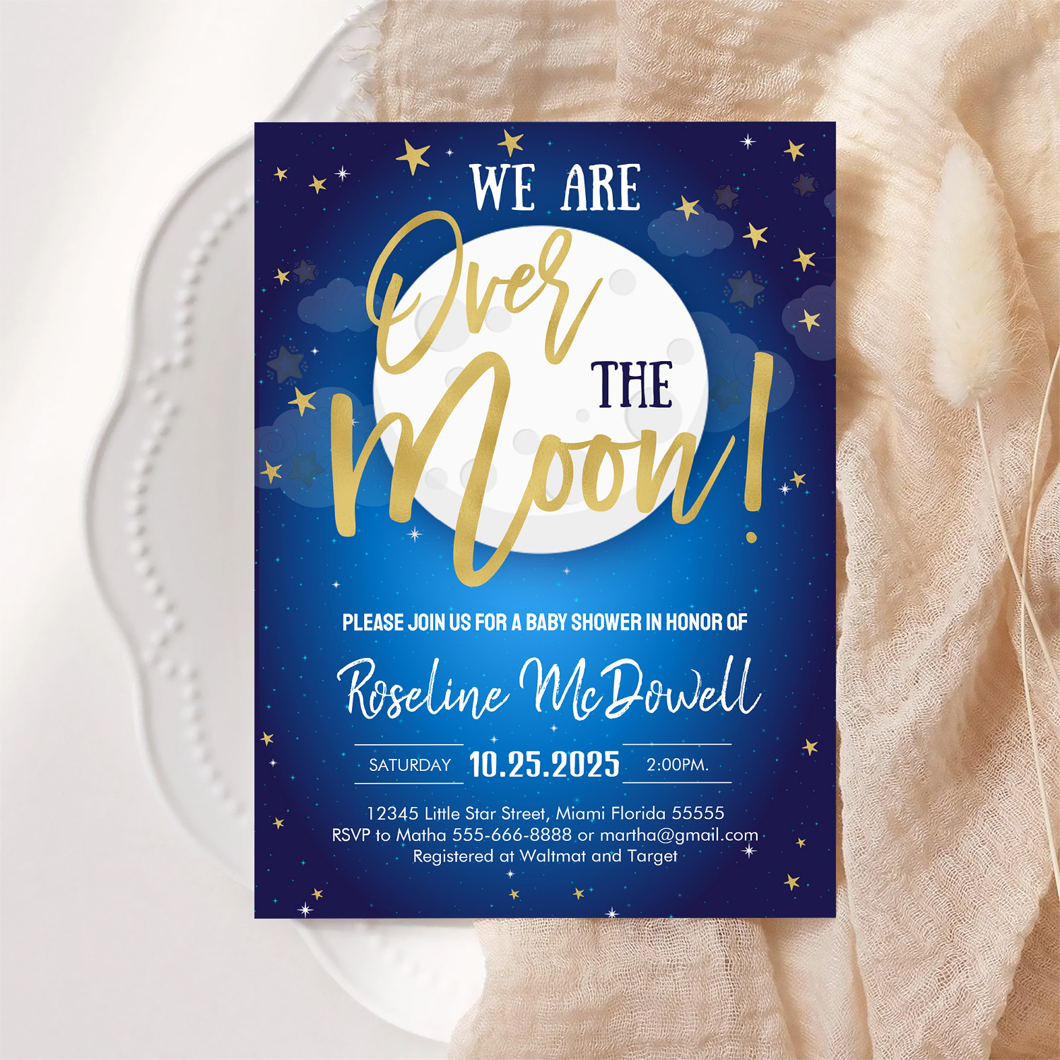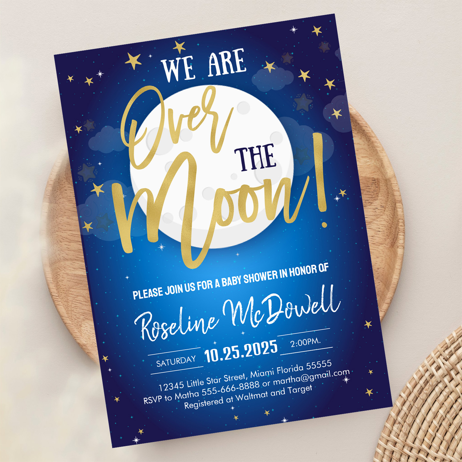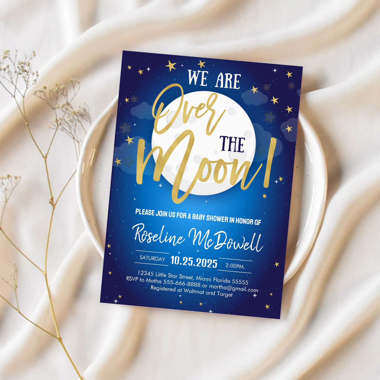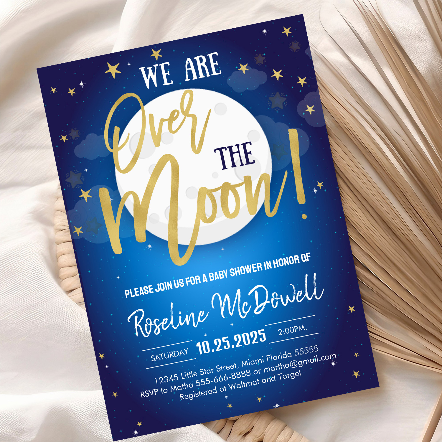 Over The Moon Galaxy Space Themed Baby Shower Invitation
