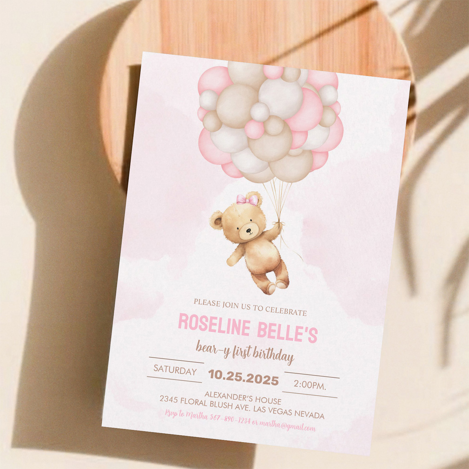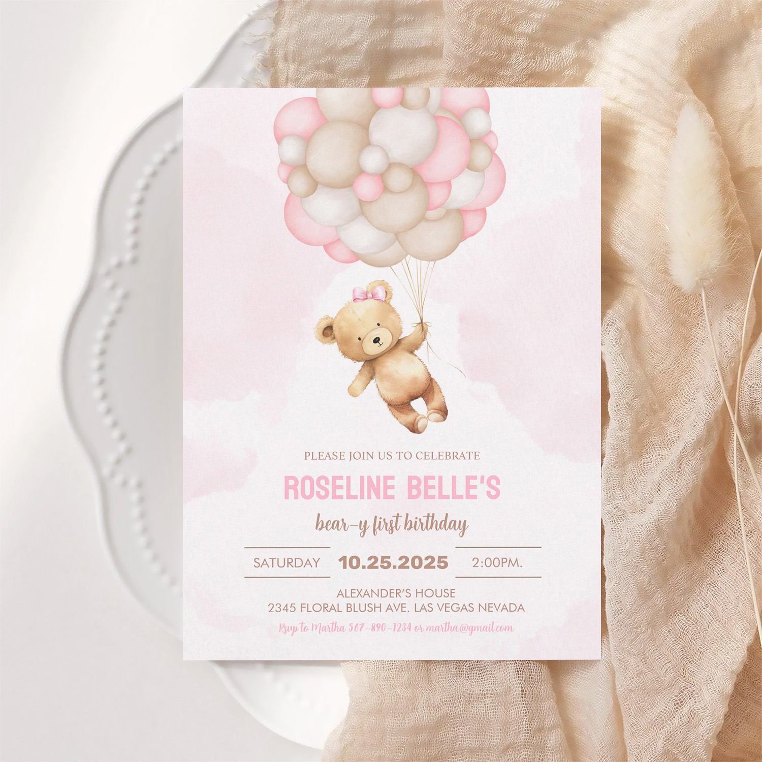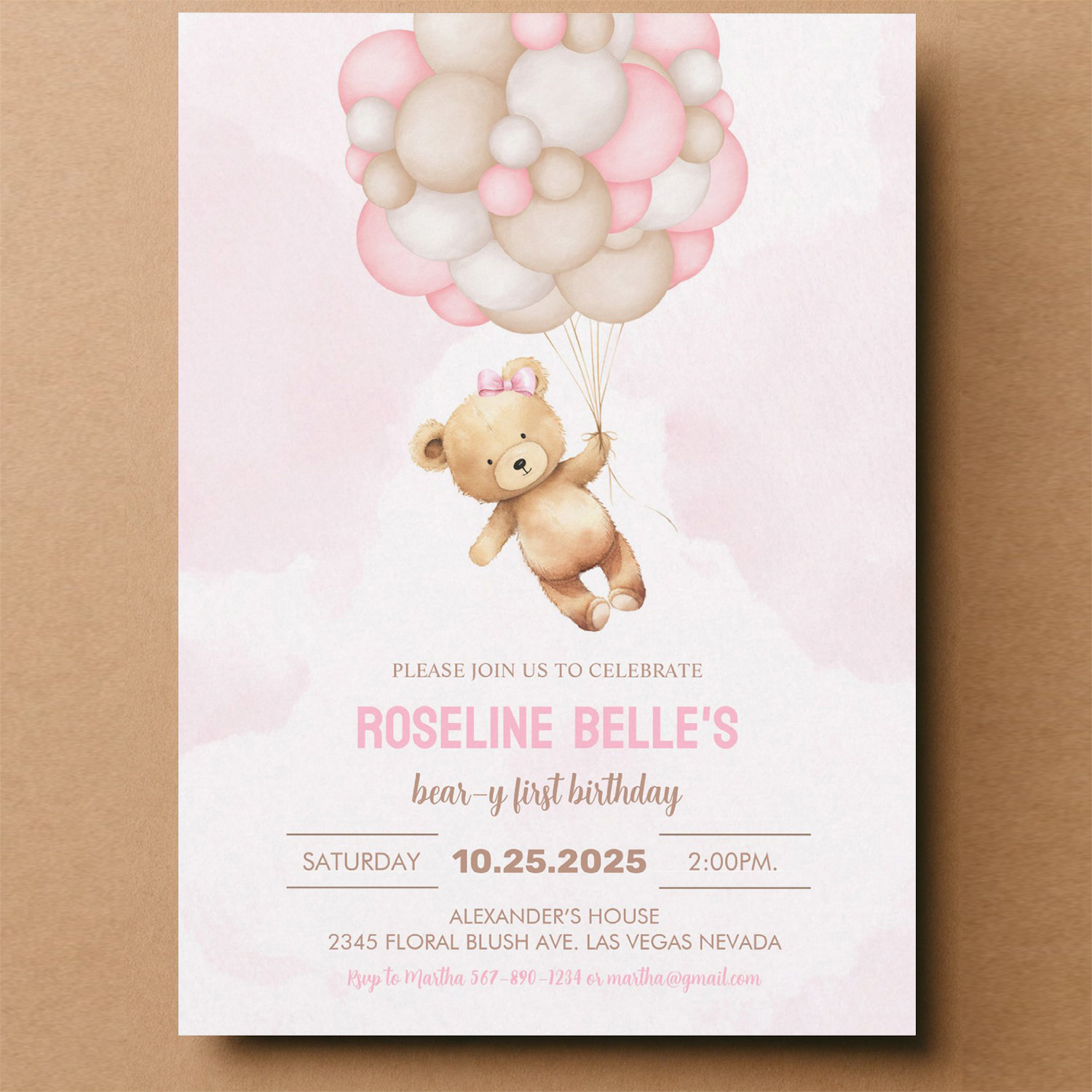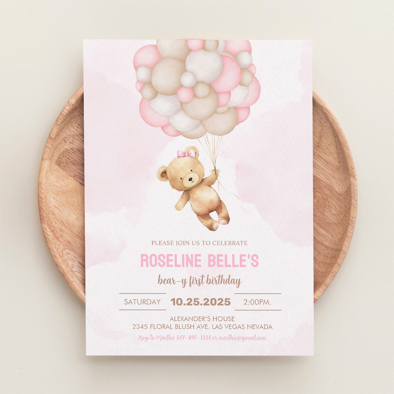 Teddy Bear Girl 1st Beary First Birthday Invitation