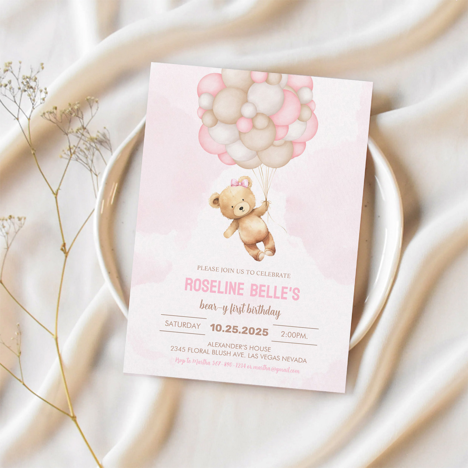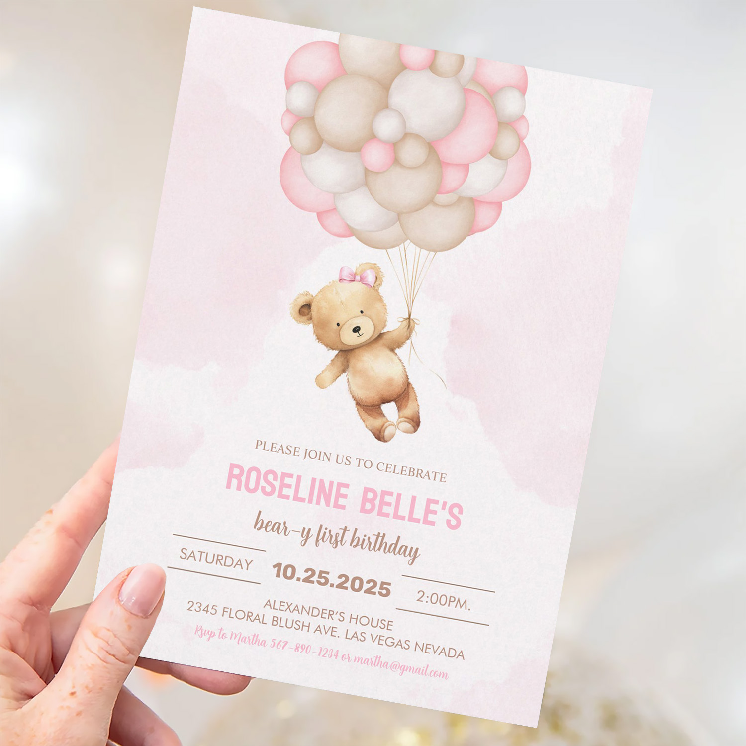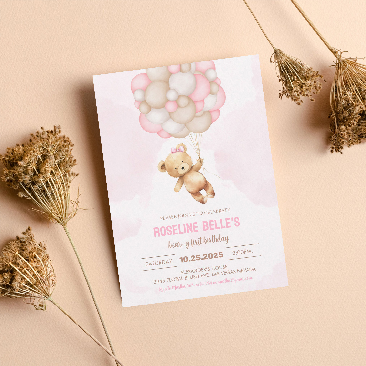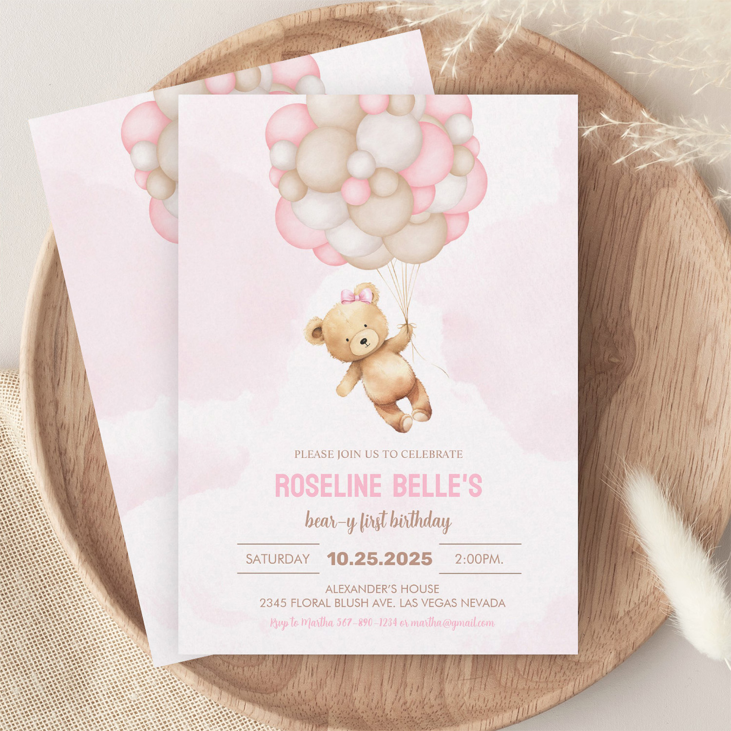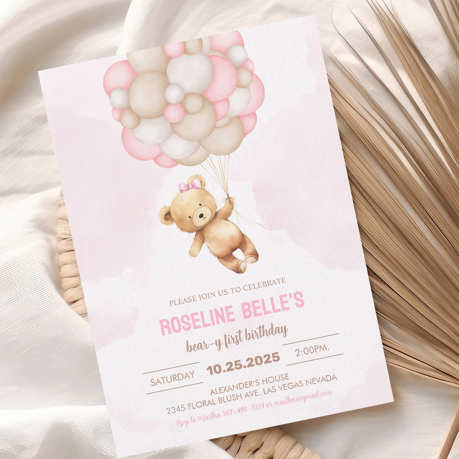 Teddy Bear Girl 1st Beary First Birthday Invitation